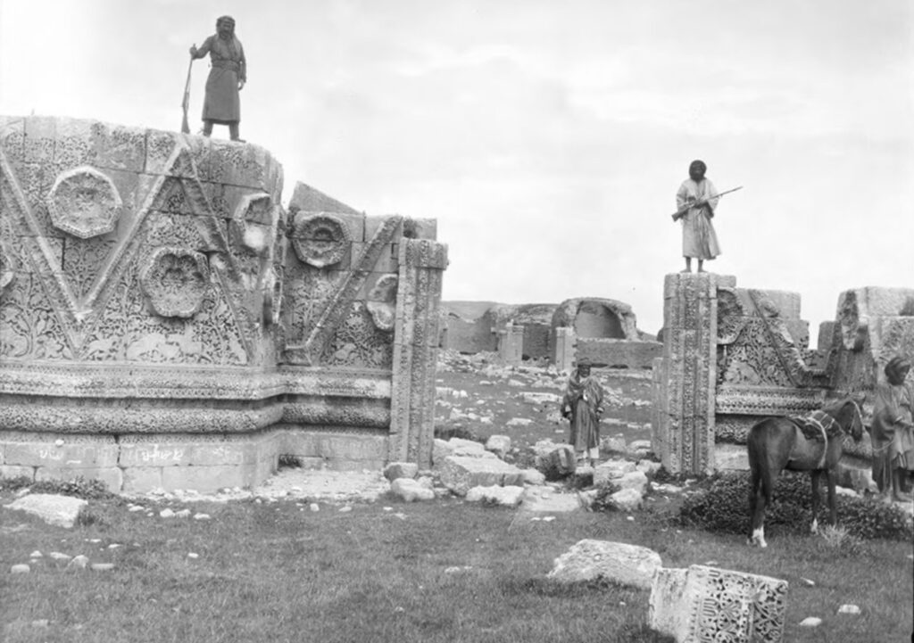 [10] Gertrude Bell, Photograph: Mashetta, the gateway (remains of gateway with detailed carving to the palace; men standing on gateway, horses in foreground), 22 March 1900, GB/3/1/1/1/233, Gertrude Bell Archive, Special Collections, Newcastle University, near Amman, Jordan. https://gertrudebell.ncl.ac.uk/p/gb-3-1-1-1-233.