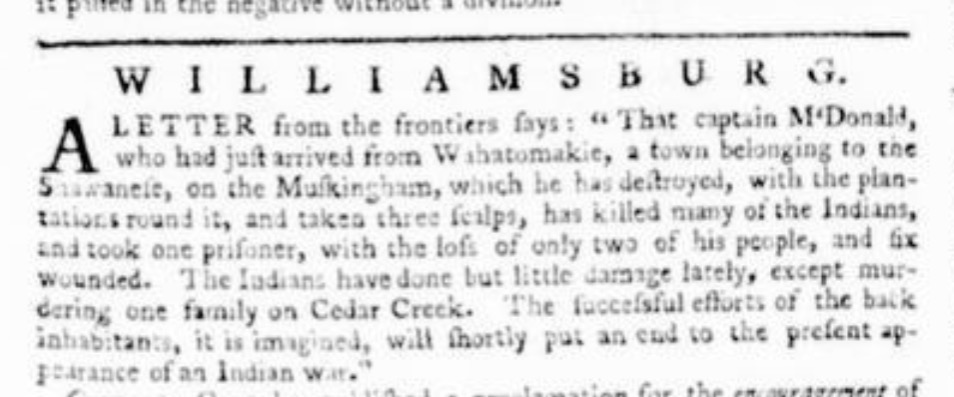 [11] Virginia Gazette (Williamsburg, VA), no. 426, July 7, 1774, microfilm copy, Rockefeller Library, Colonial Williamsburg Foundation Digital Collections, Williamsburg, Virginia, accessed February 20, 2026, https://digitalcollections.colonialwilliamsburg.org/asset-management/2RERYDTDXLT7