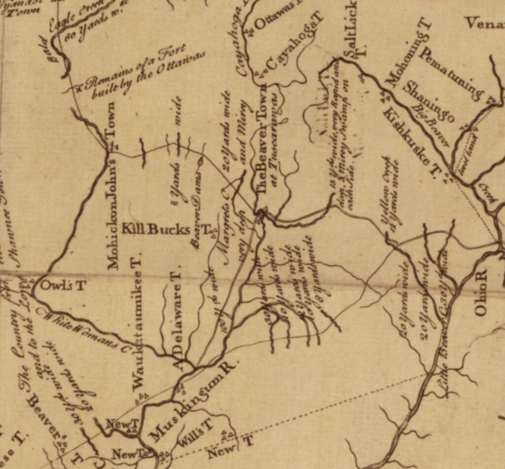 [2] Thomas Hutchins, A General Map of the Country on the Ohio and Muskingham Showing the Situation of the Indian-Towns with Respect to the Army under the Command of Colonel Bouquet, March of His Majesty’s Troops from Fort Pitt to the Forts of Muskingham in 1764 (Philadelphia, 1765), Library of Congress, Rare Book and Special Collections Division, https://www.loc.gov/item/2001695748/